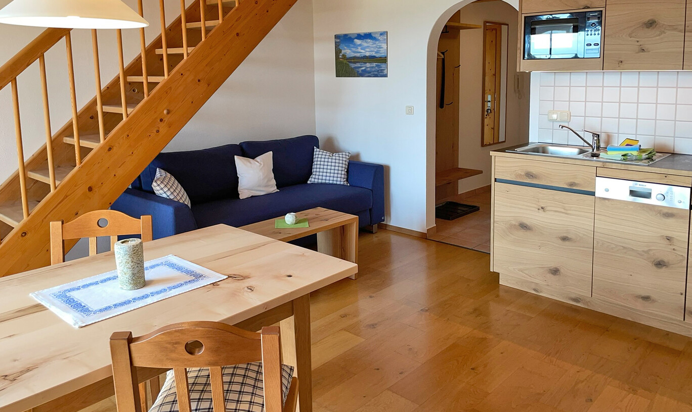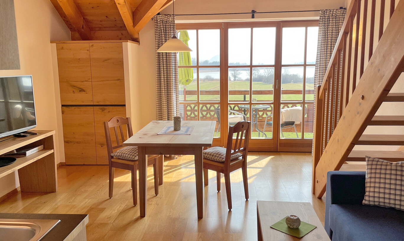 Die 40 qm große Ferienwohnung befindet sich im 2. Stock des See Cafe Toni, ein einzelstehendes Landhaus am Nordufer des Chiemsees mit Blick über die Schafwaschener Bucht und auf die Chiemgauer Alpenkette. Direkt am Chiemsee-Rad- und Uferweg in Hochstätt gelegen, einem Ortsteil von Rimsting, im wunderschönen Chiemgau in Oberbayern.