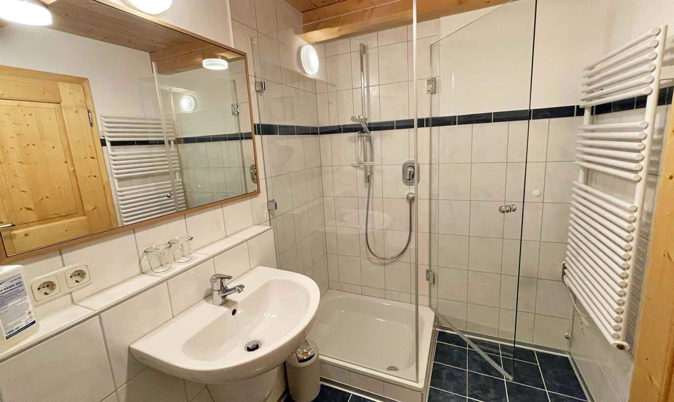 - Bad mit Dusche, WC, Föhn, Handtücher, Badetücher, Kosmetiktücher und -spiegel