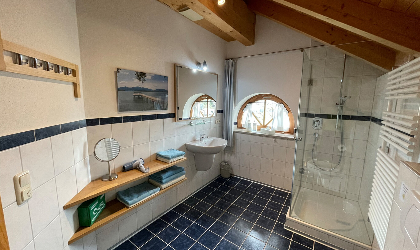 - Großes Bad mit Fenster, Dusche, WC, Föhn, Handtücher, Badetücher, Kosmetiktücher und -spiegel