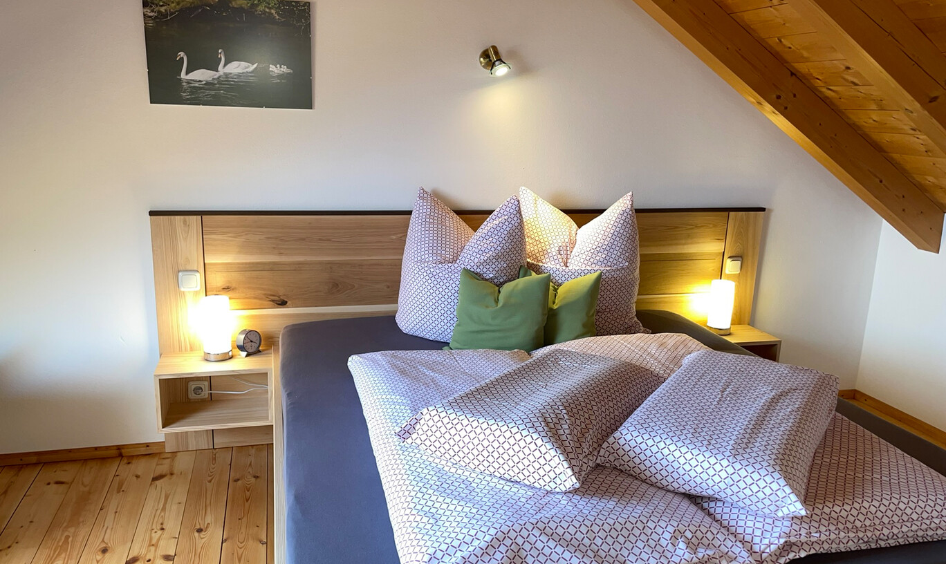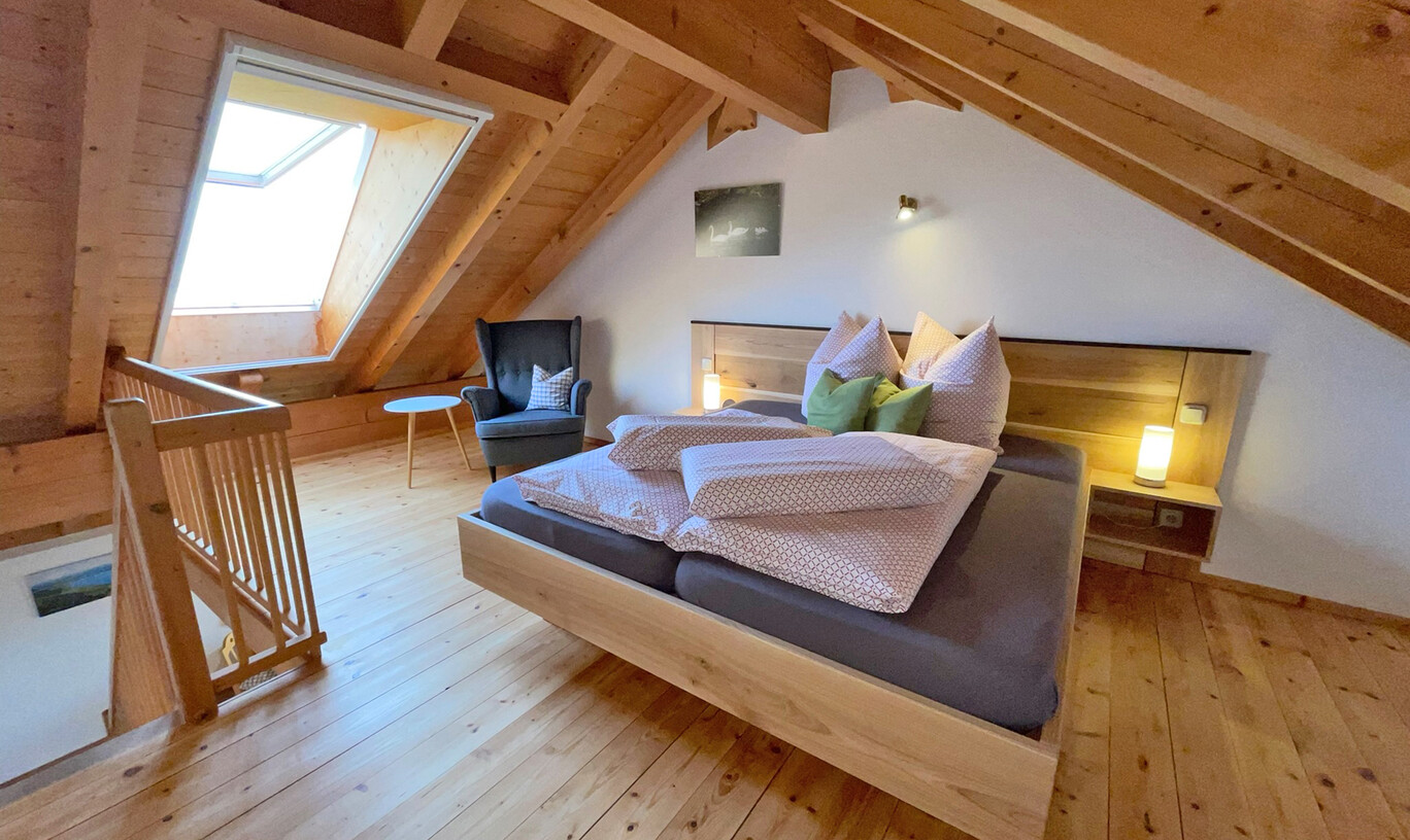 - Schlafgalerie mit großem Dachfenster und direktem Seeblick, Bettwäsche, Nackenkissen, Ruhesessel und Wecker, Verdunkelungsrollo und Mückengitter, Stand-Ventilator