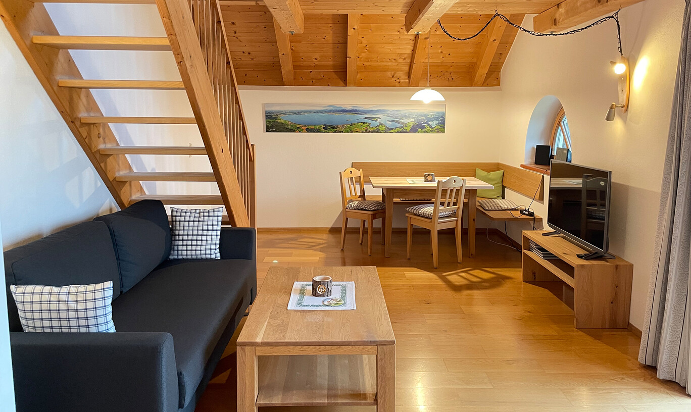 Die 50 qm große Ferienwohnung befindet sich im 2. Stock des See Cafe Toni, ein einzelstehendes Landhaus am Nordufer des Chiemsees mit Blick über die Schafwaschener Bucht und auf die Chiemgauer Alpenkette. Direkt am Chiemsee-Rad- und Uferweg in Hochstätt gelegen, einem Ortsteil von Rimsting, im wunderschönen Chiemgau in Oberbayern.