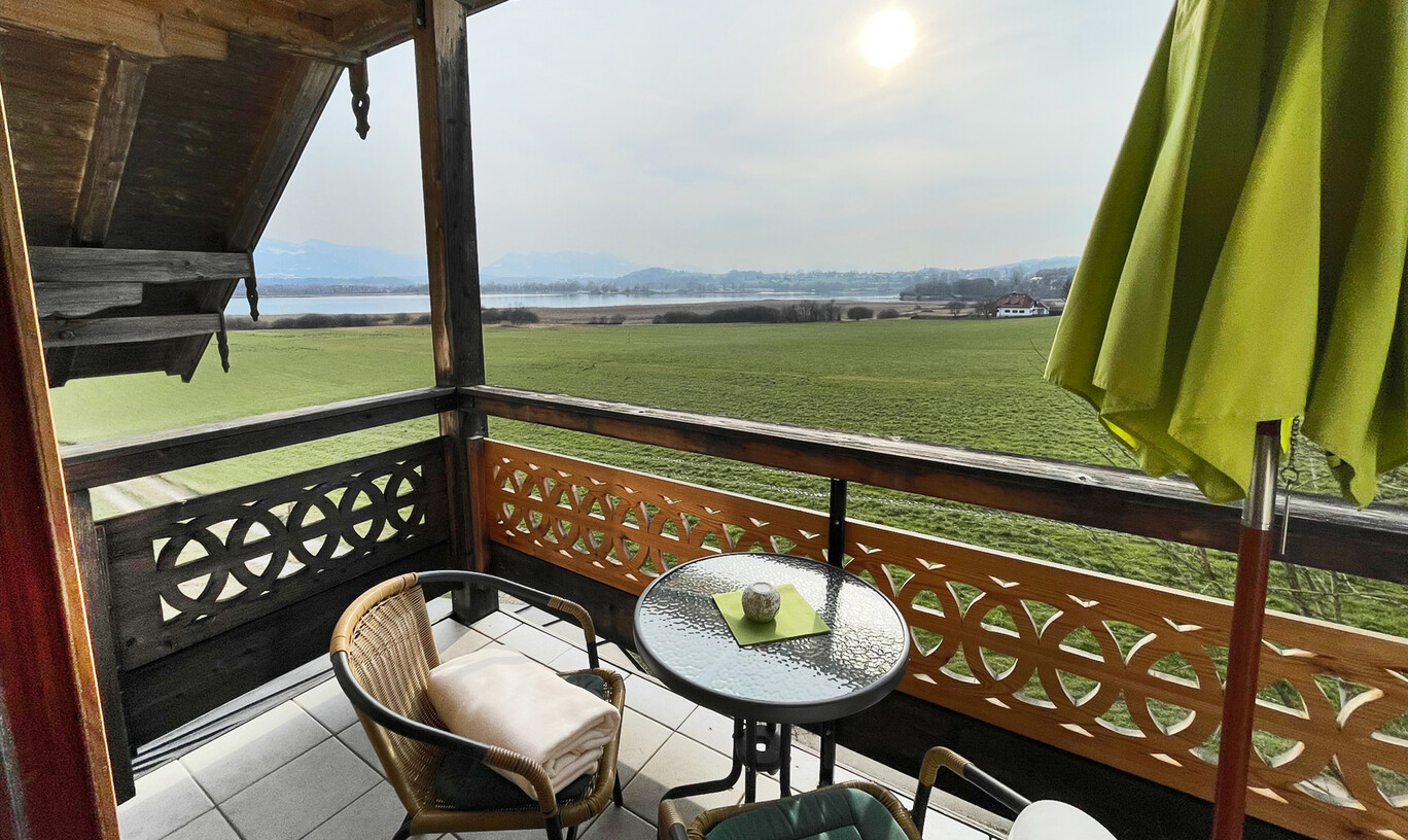 - Eigener Balkon – unser Sundowner – mit herrlichem Blick zum Chiemsee, zu den Chiemgauer Bergen und über Rimsting schweifend zur Ludwigshöhe – perfekt um die Abendsonne zu genießen und zum Tagesausklang einen wunderschönen Sonnenuntergang zu erleben!